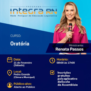 Mais um curso incrível está chegando, e desta vez o tema é Oratória! Se você tem paixão pela comunicação e deseja aprimorar suas habilidades de falar em público, não perca tempo: baixe o aplicativo da Escola da Assembleia Legislativa do RN e faça sua inscrição. O curso ocorrerá no dia 21 de fevereiro, das 8h às 17h, na Câmara Municipal de Pedra Grande.